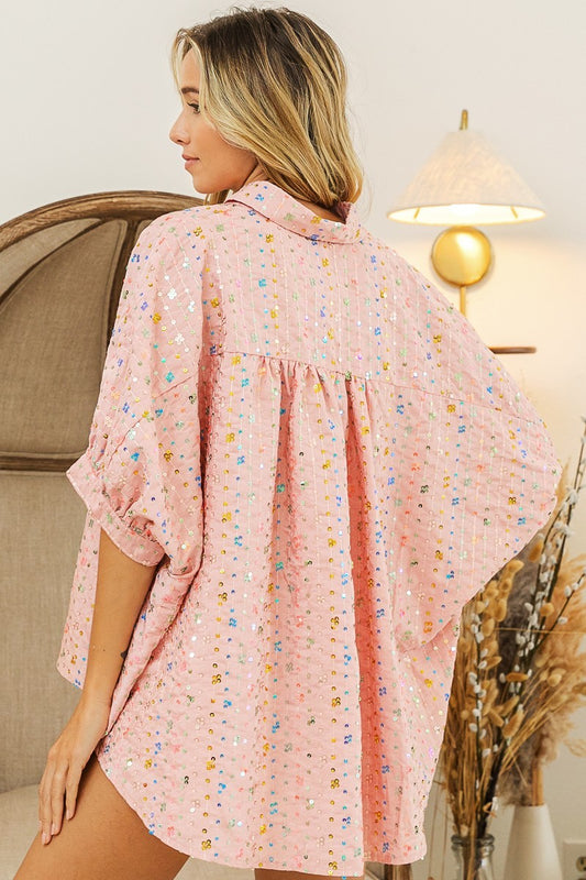 BiBi Sequin Striped Pattern Dolman Sleeves Buttoned Oversized Blouse | Blush