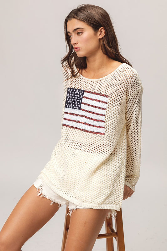 BiBi Sequin Embellishments American Flag Patch Open Knit Cover Up Top | Oatmeal