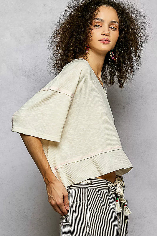 POL Round Neck Half Sleeves Contrast Stitch Detail Cropped Rib T-Shirt | Natural
