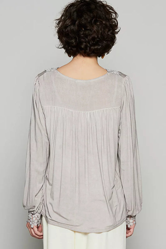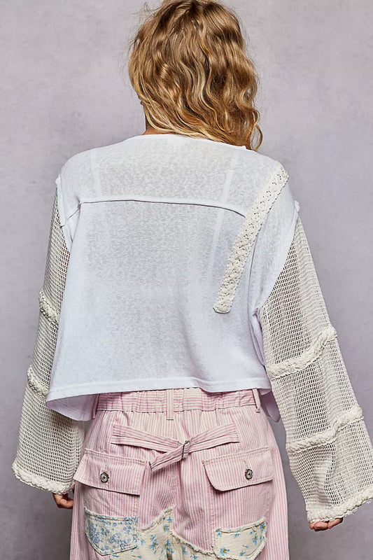 POL Crew Neck Crochet See Through Sleeves Patch Pocket Washed Blouse | Off White
