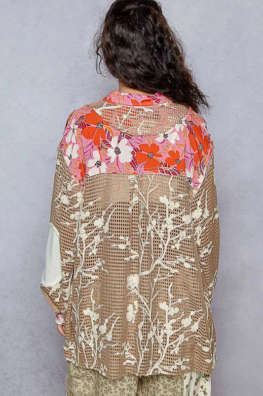 POL Floral Pattern Crochet Detail Raw Hem Button Up Oversized Shirt | Chocolate