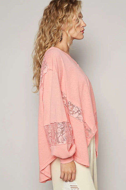 POL V-Neck Long Sleeves Delicate Lace Details High-Low Oversized T-Shirt | Blush