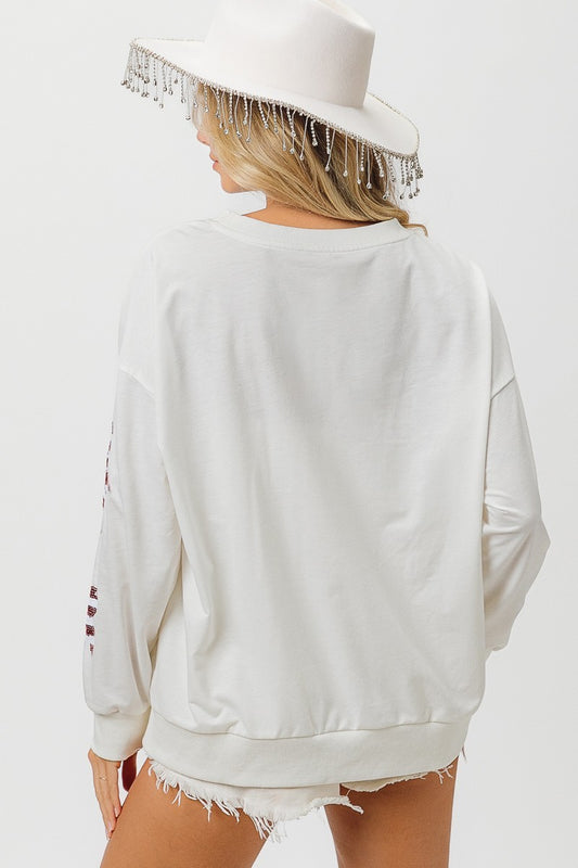 BiBi 4th Of July American Flag Theme Sequin Star Patches French Terry Sweatshirt