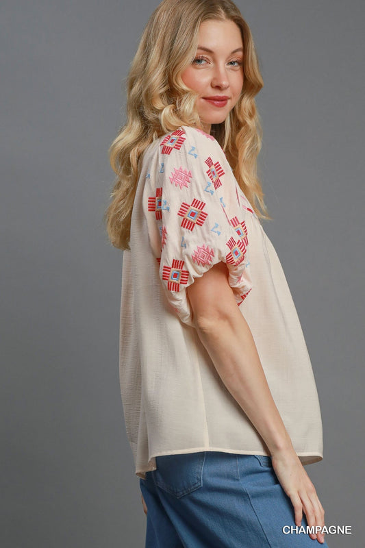 Umgee Embroidered Short Puff Sleeves Mock Neck Ruffled Detail Blouse | Champagne