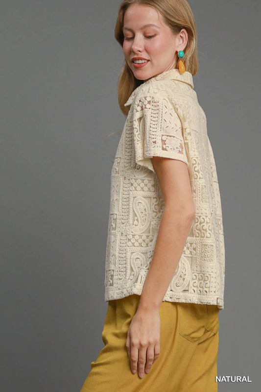 Umgee Lace Patches Detail Short Sleeves Button Down Relaxed Fit Shirt | Natural
