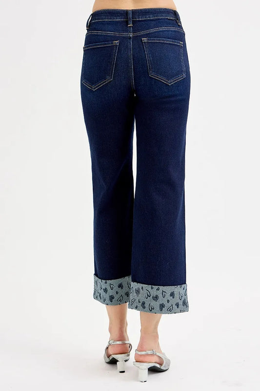 RISEN Mid Rise Waist Printed Cuffed Hem Dark Washed Cropped Wide Leg Denim Jeans