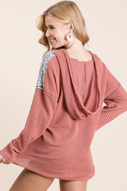 BiBi Popcorn Waffle Knit Printed Color Block Casual Hooded Sweatshirt | Black