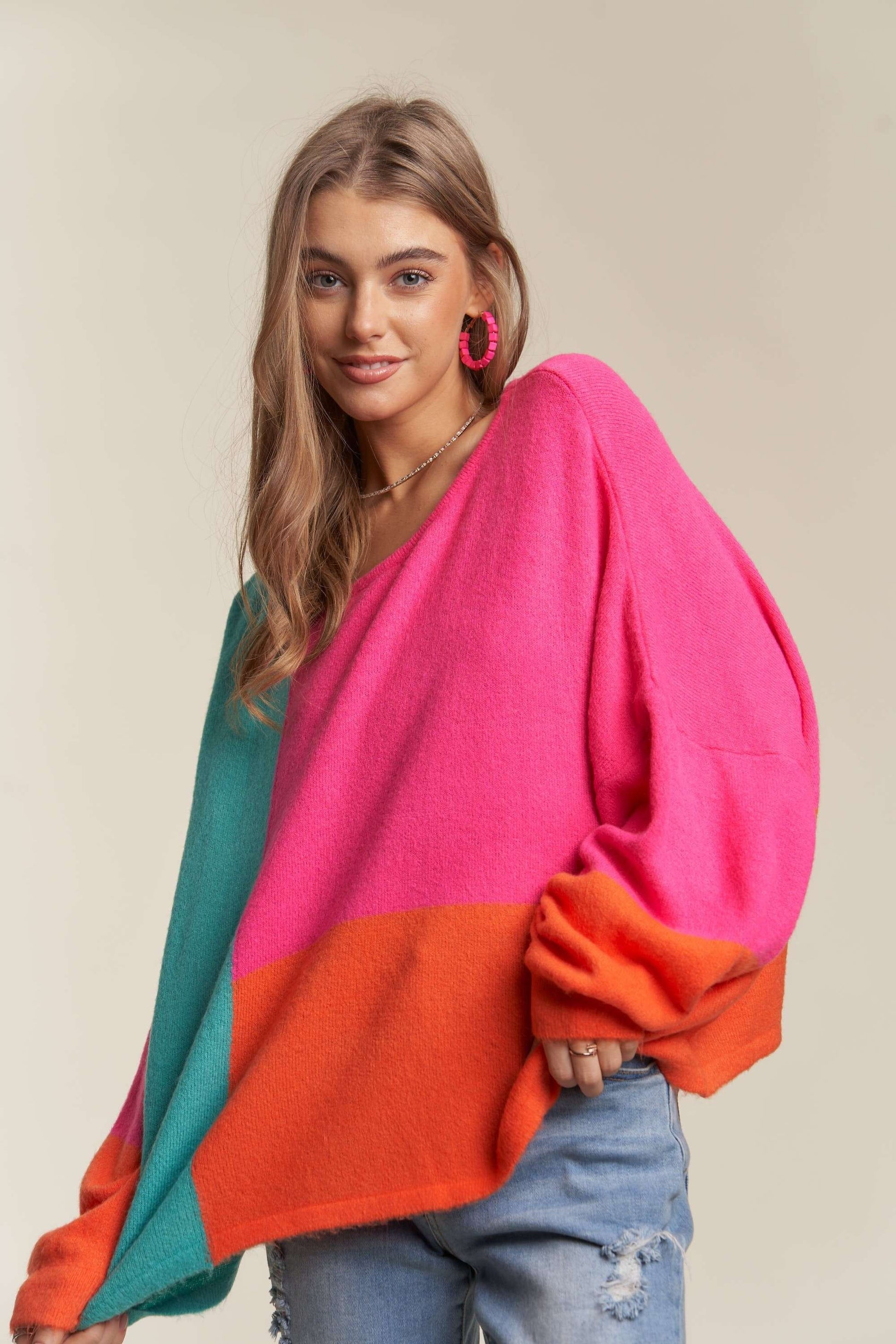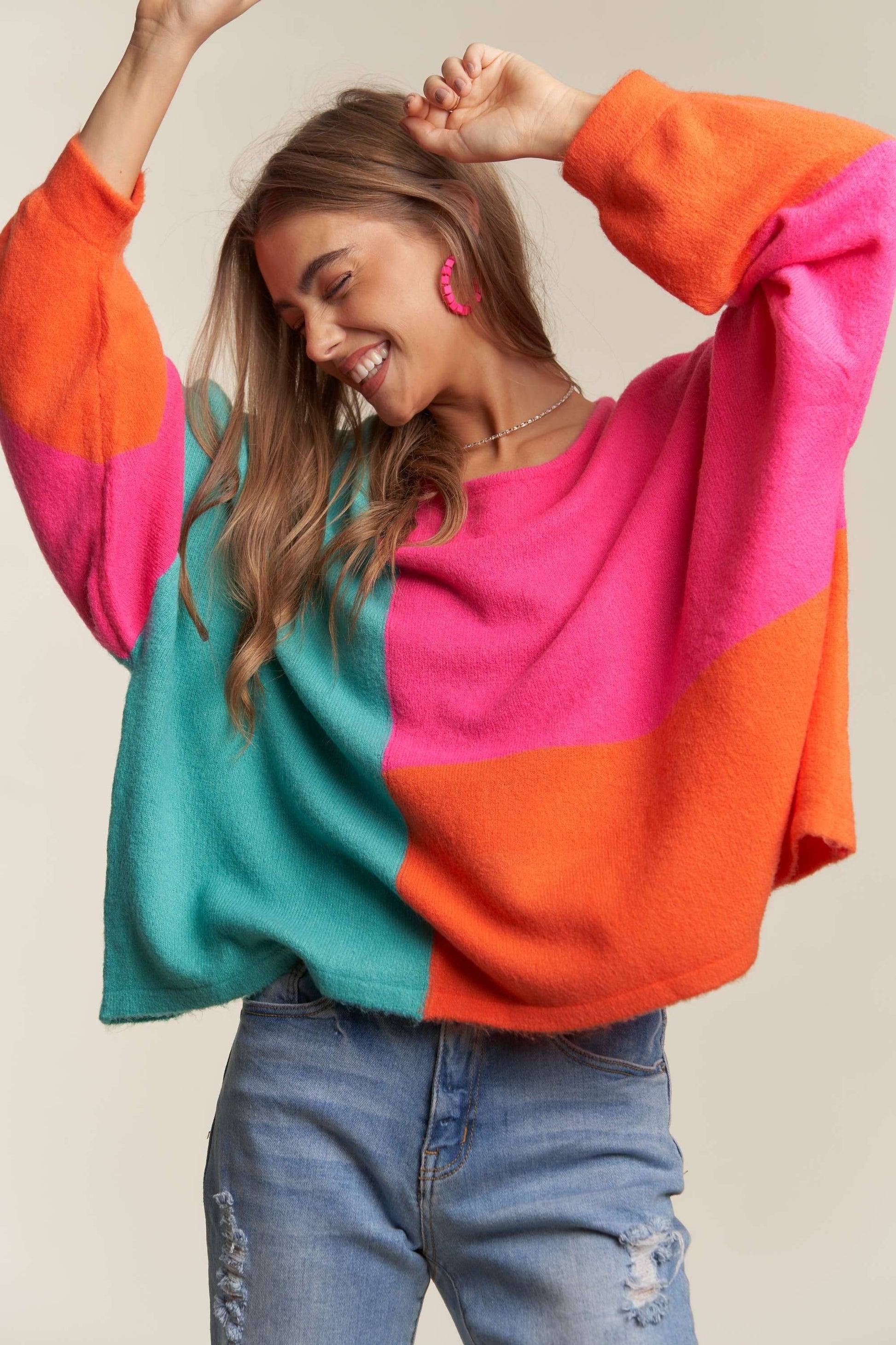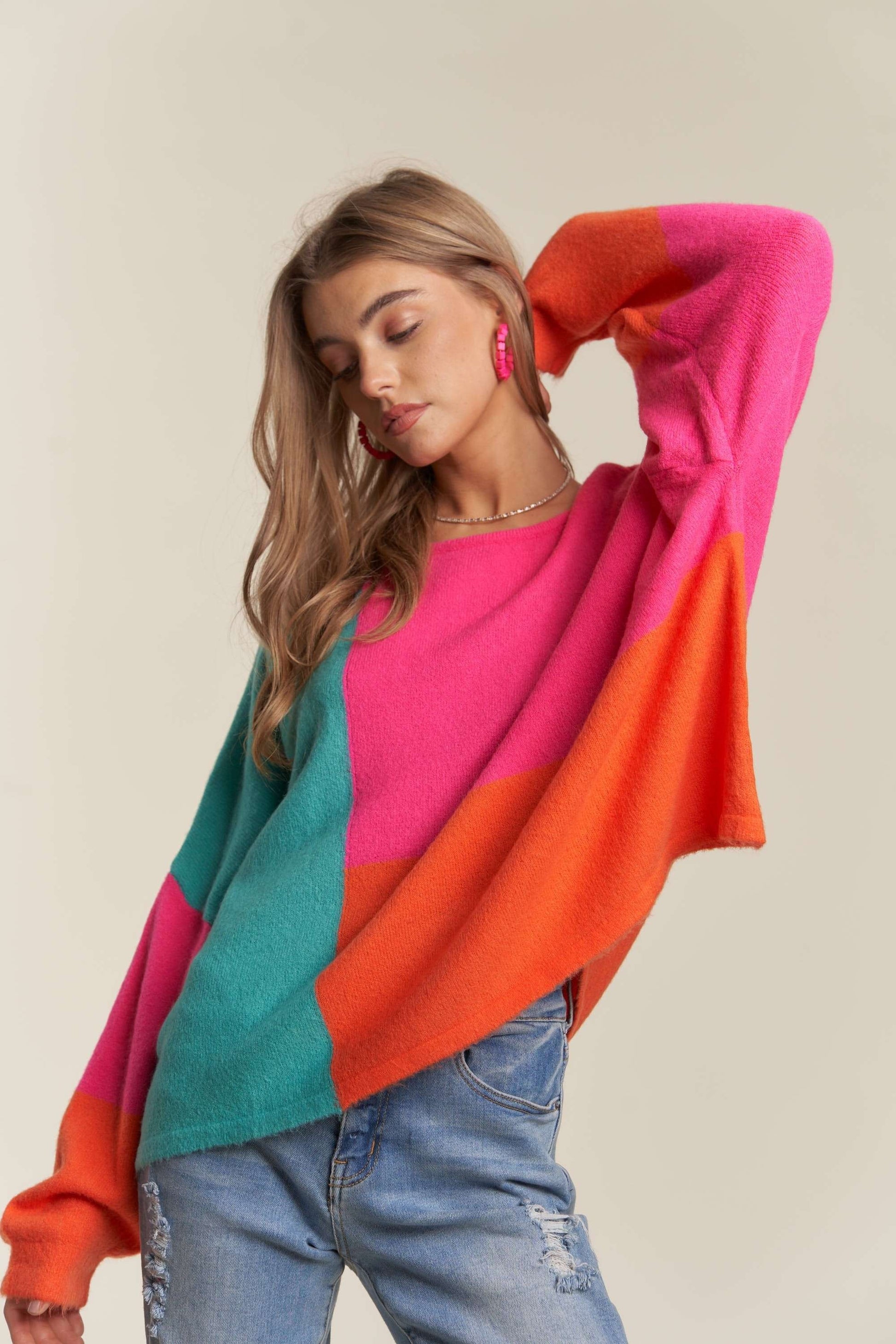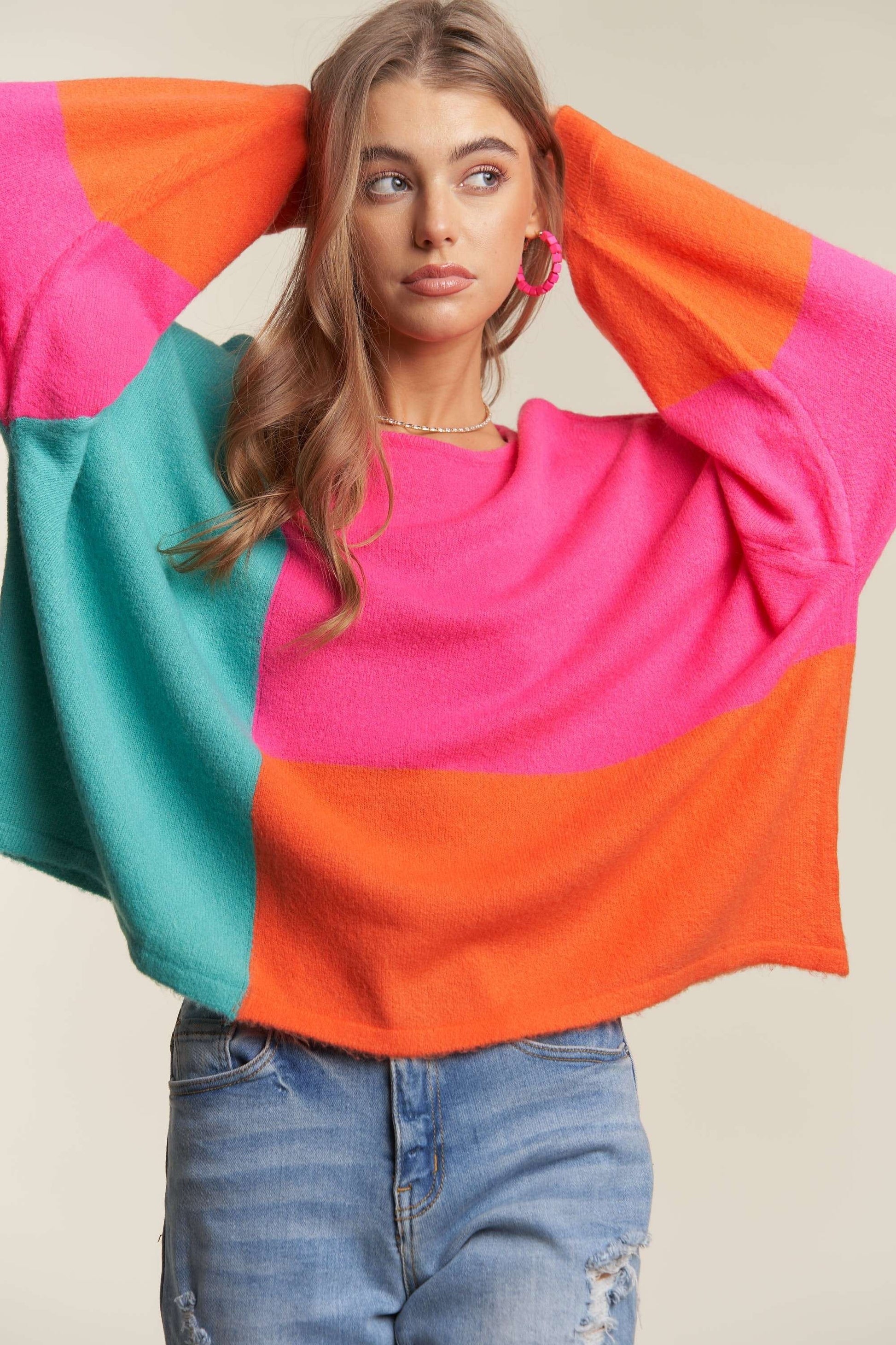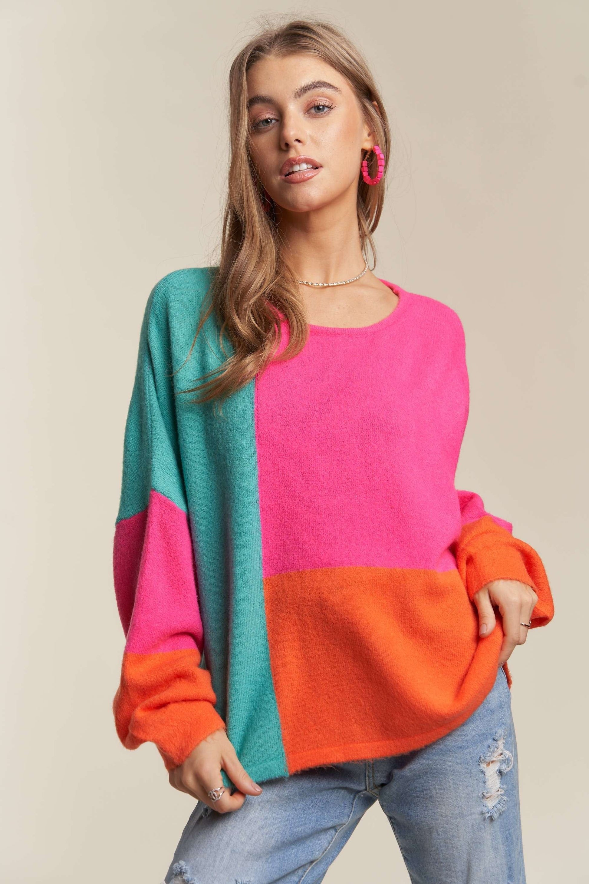 ADORA Color Block Long Sleeves Round Neck Oversized Pullover Sweater | Hot Pink