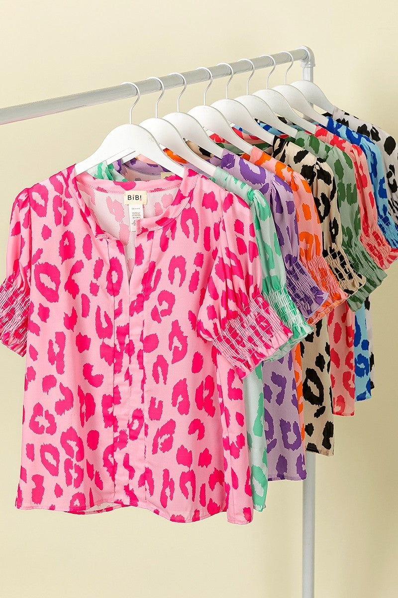 BiBi Leopard Pattern Smocked Short Sleeves V-Neck Relaxed Fit Blouse | Coral