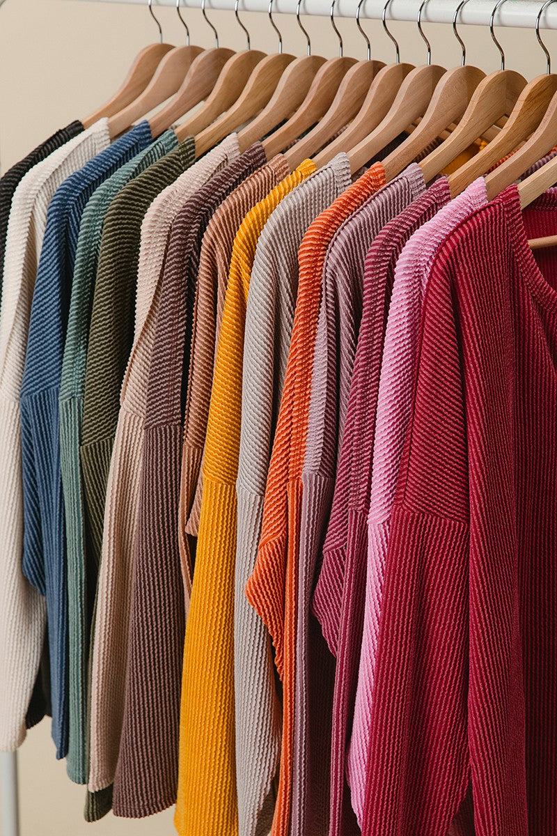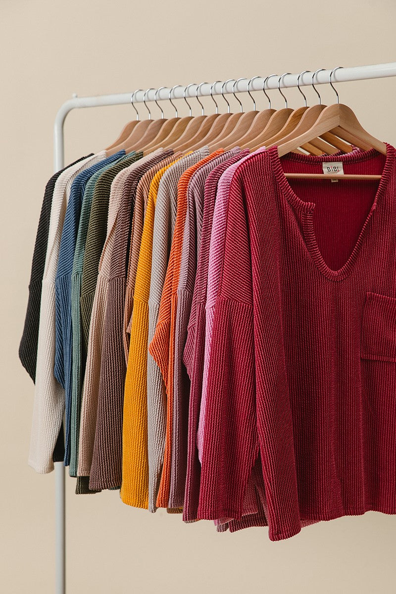 BiBi Wavy Two Tone Rib Notch Neck Patch Pocket Detail Long Sleeves Top | Mustard