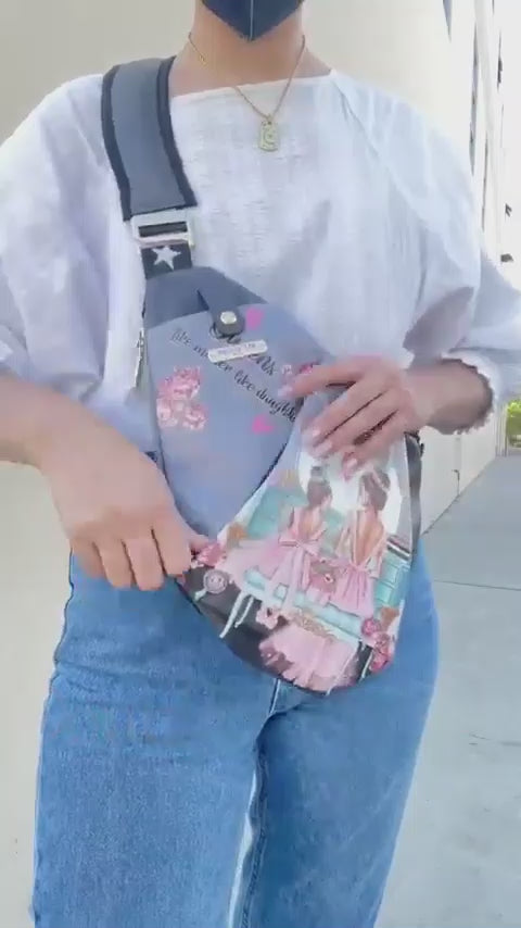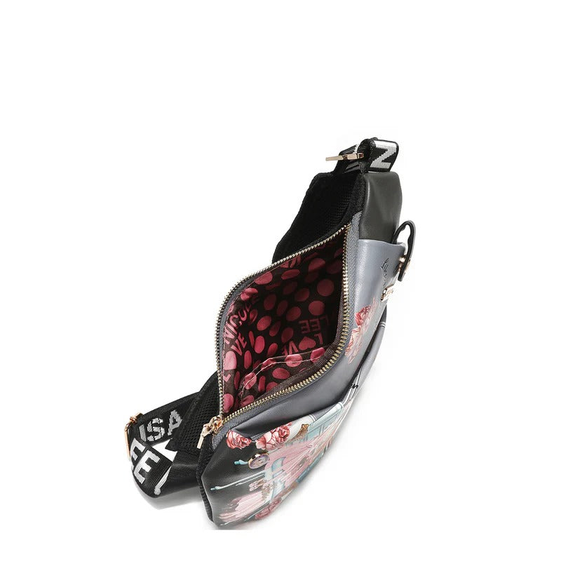 Adjustable logo webbed strap with shoulder padding.