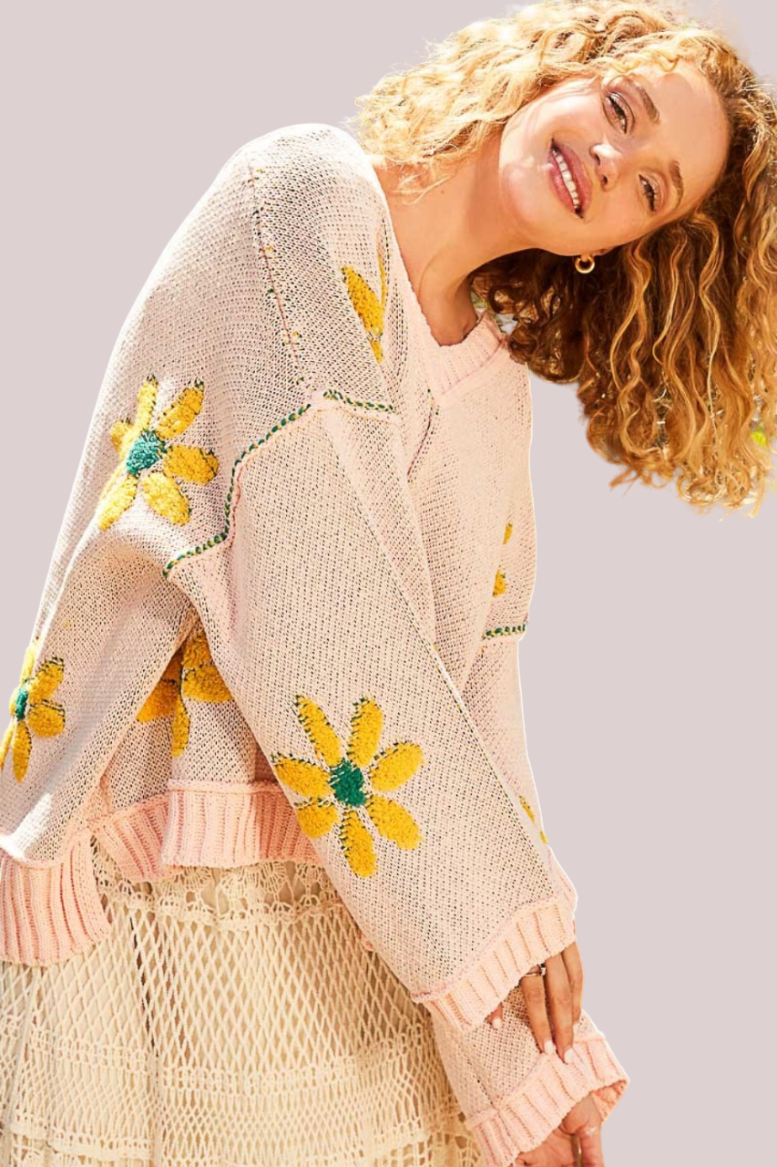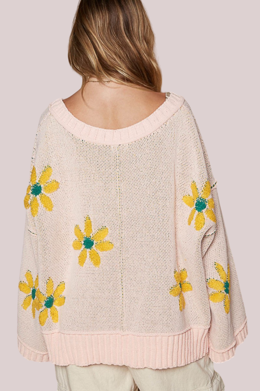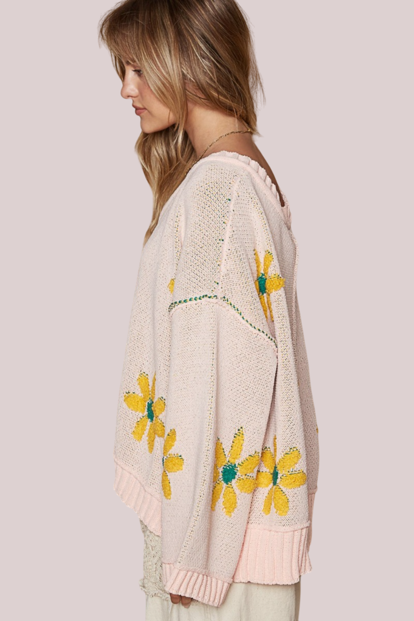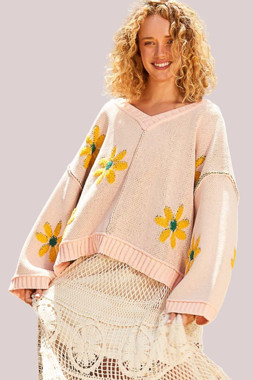 POL V-Neck Floral Pattern Chenille Long Sleeves Pullover Sweater | Pink Mojito
