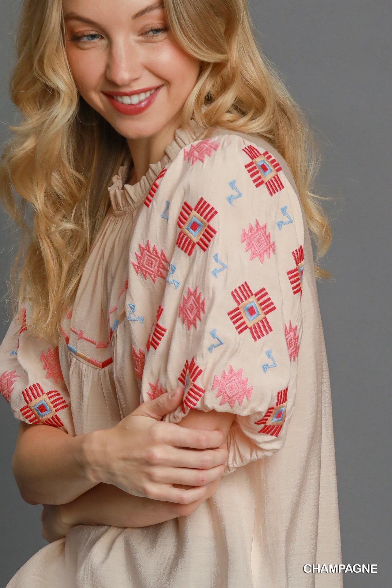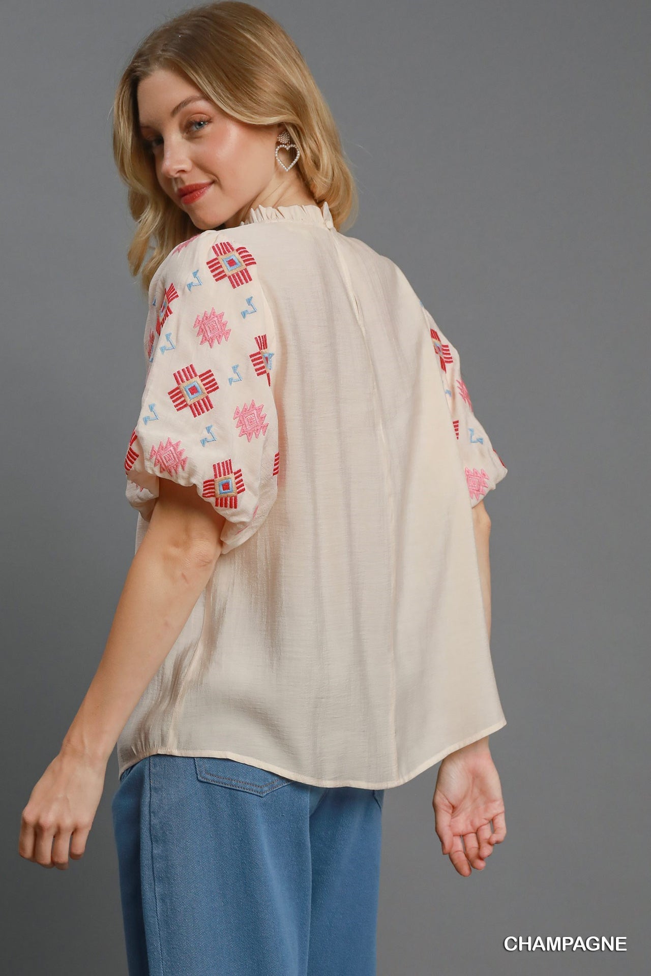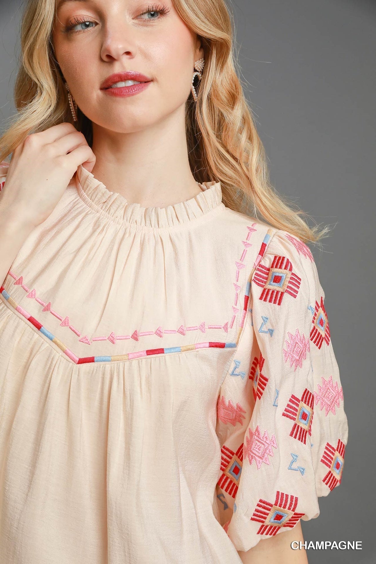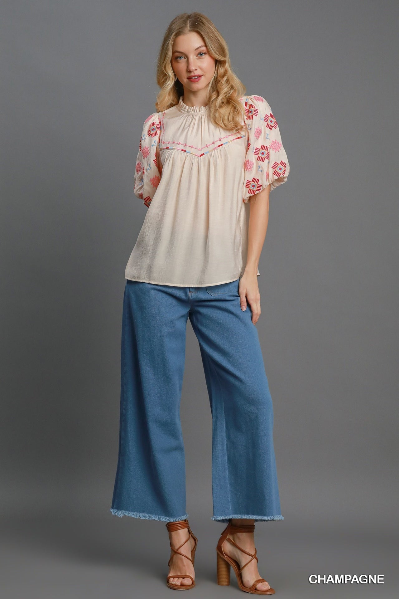 Umgee Embroidered Short Puff Sleeves Mock Neck Ruffled Detail Blouse | Champagne
